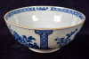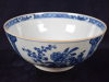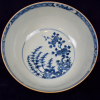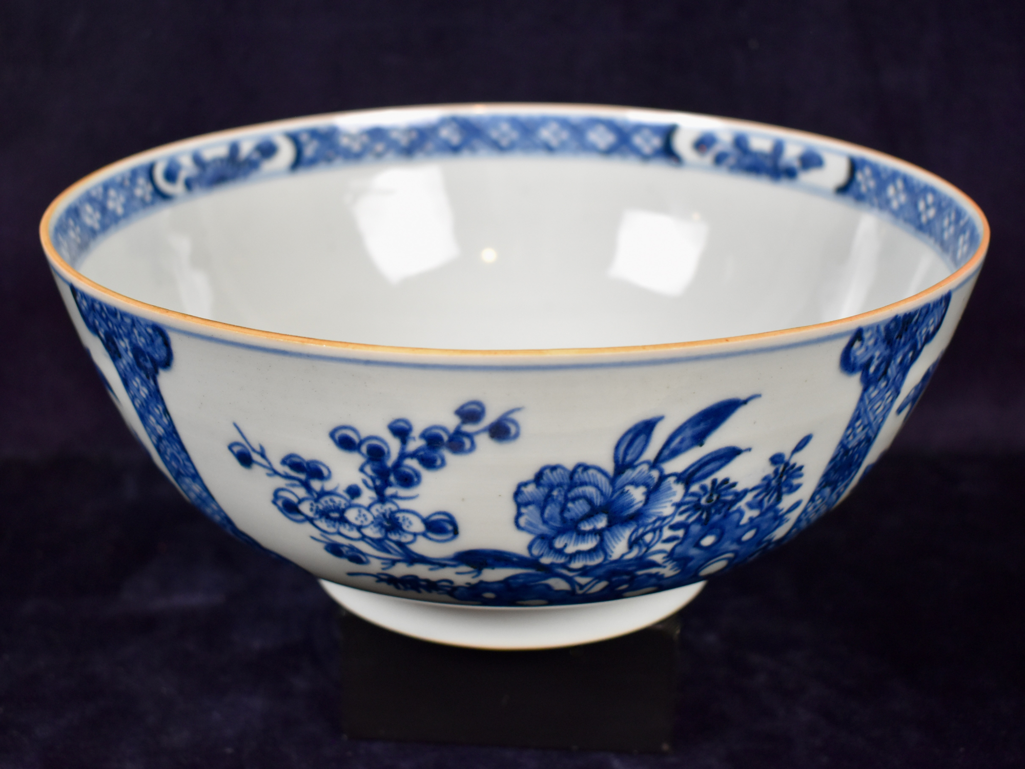 The porcelain bowl decorated in underglaze blue with four panels with flowering plants. The inside with flowering plants on rockwork in a roundel.