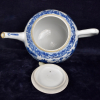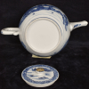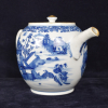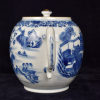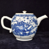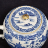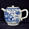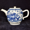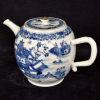 The teapot decorated in shades of blue on both sides with a temple in a river landscape under a row of flower motifs. The slightly domed cover with finial with a gilt top. Chinese export ware made for the British market.