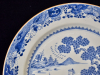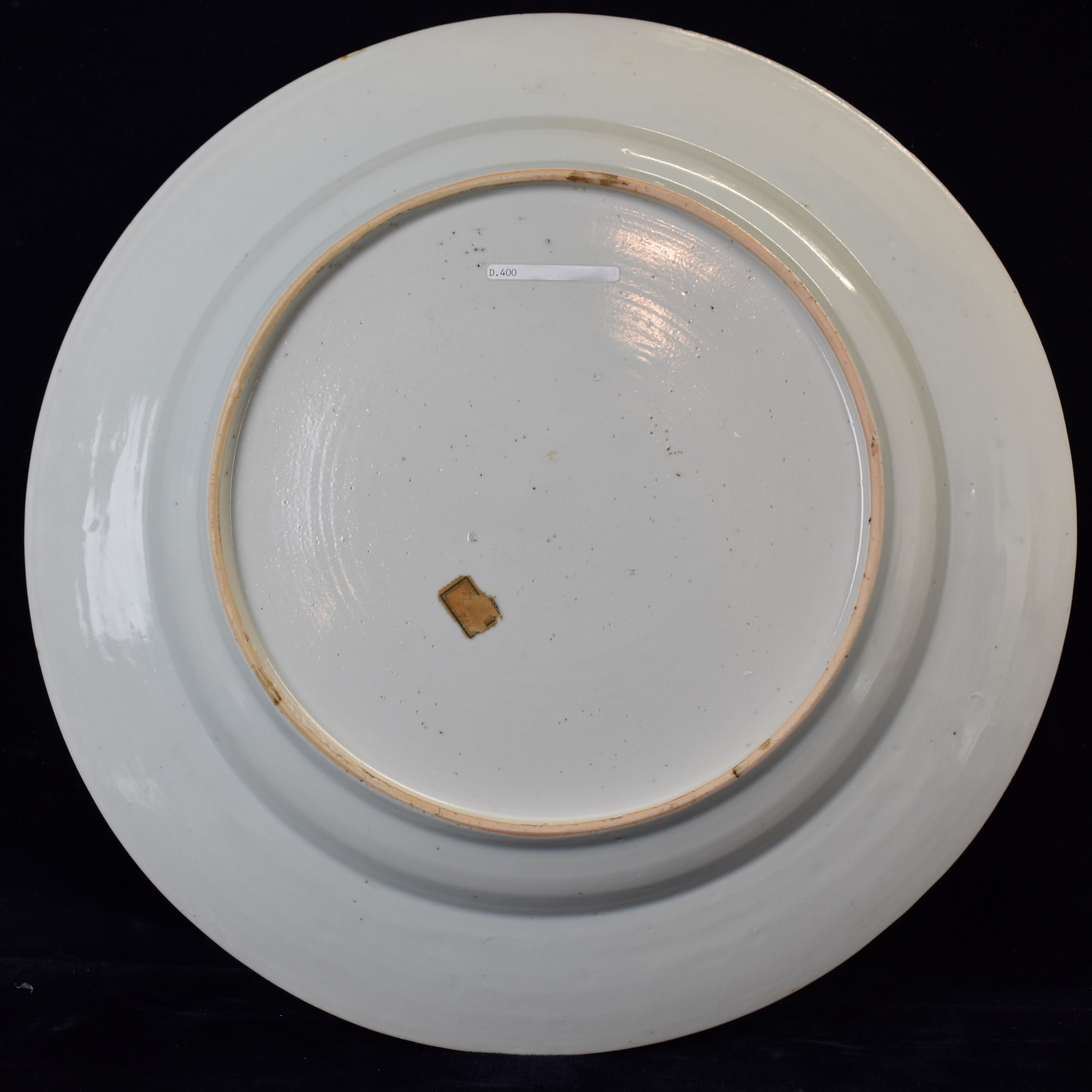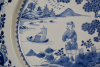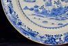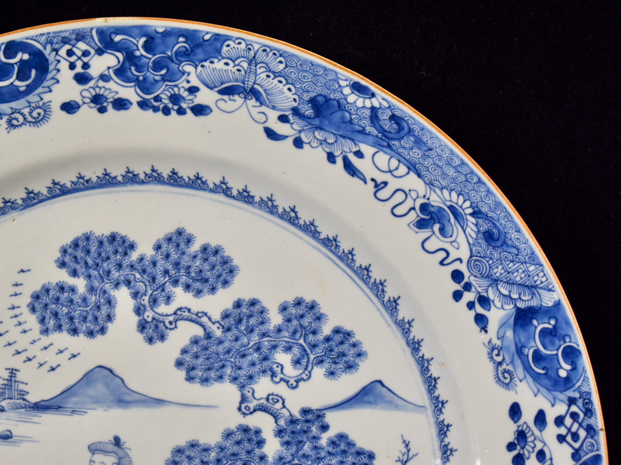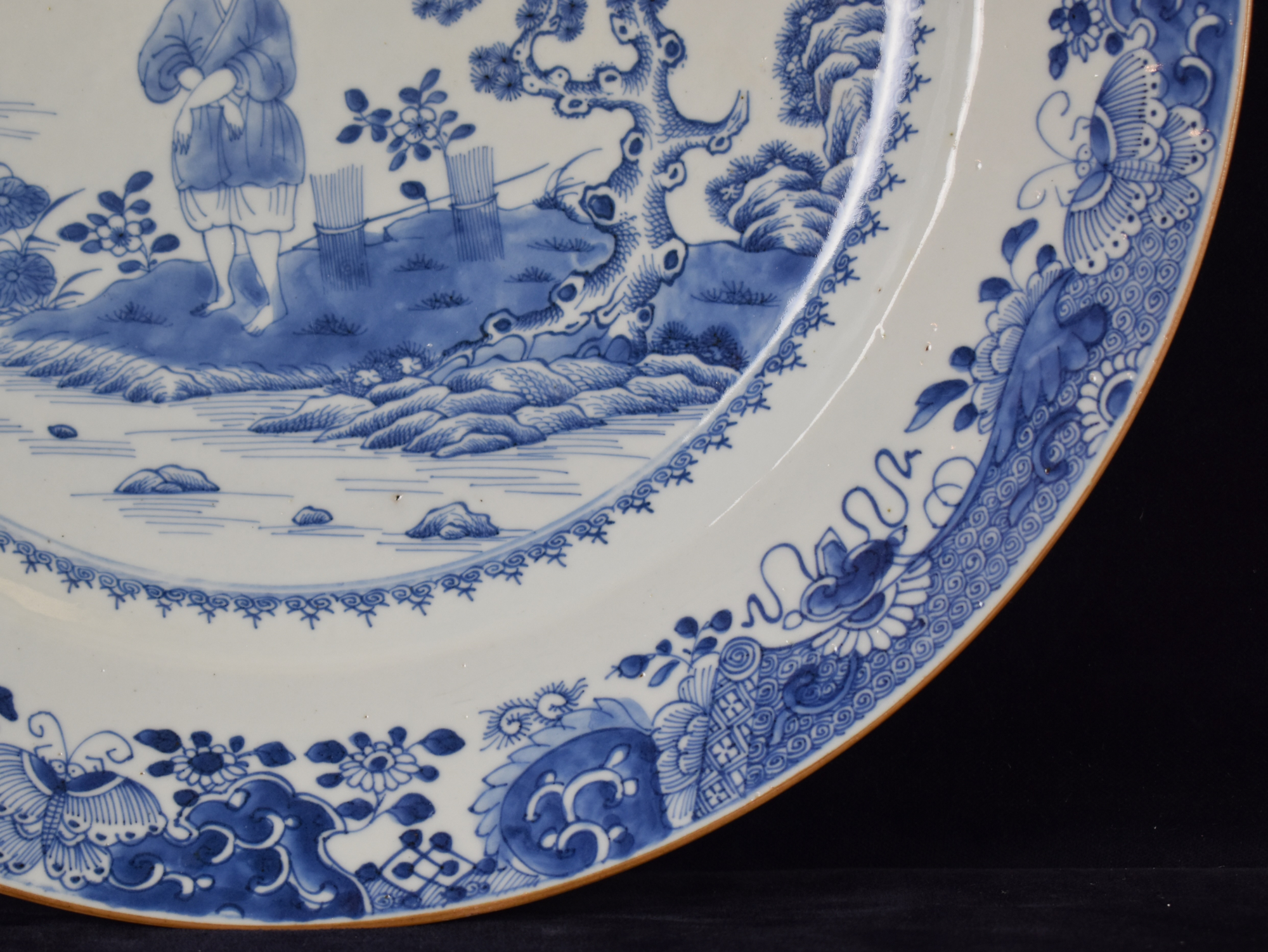 The large charger decorated in blue in the center with an Oriental figure standing under a pine tree in a river-landscape, with a sailing boat. The border with floral motifs, scrolls and butterflies.