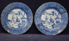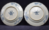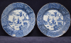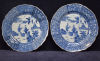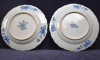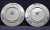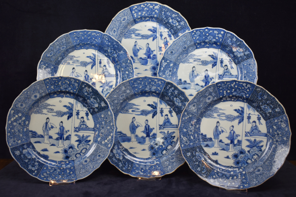 The six rimmed porcelain plated decorated in the center with three Orientals. The figure on the right leaning from the window, the left figure with a in his hand and the center figure making a gesture from the right to the left which is attended by the ohter two figures. The edge white