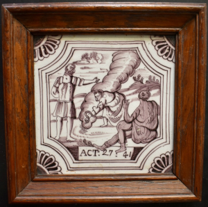 Framed Antique Dutch 18th Century Manganese Delft Bible Tile. Paul Bitten by a Sniper out of the Heat of the Fire. SOLD