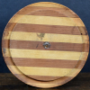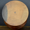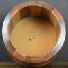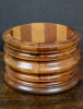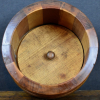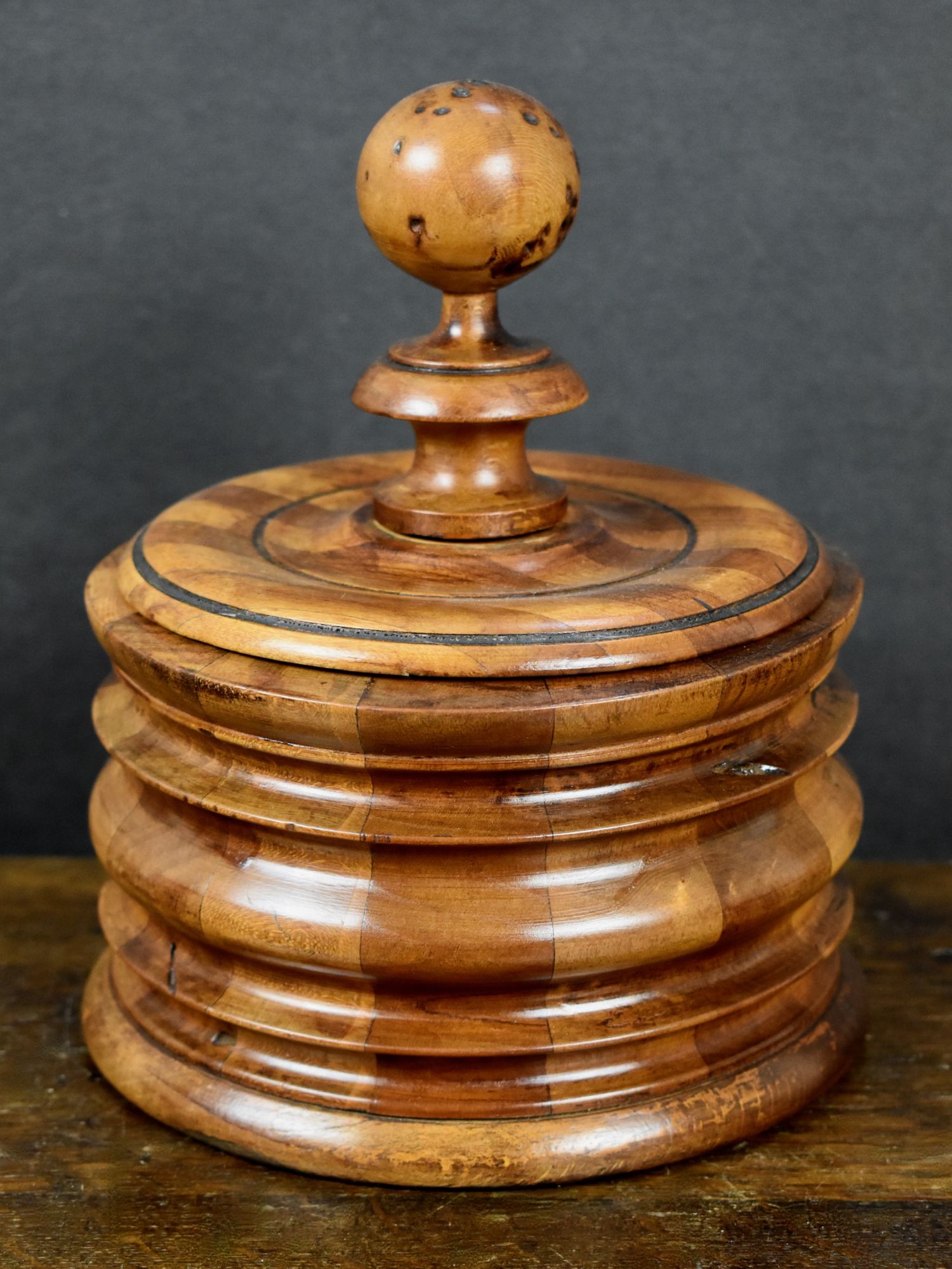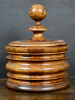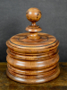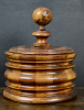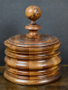The from two kinds of wood staved and round wooden tobacco jar with loose flat cover. The cover with a baluster shaped ornament with a big ball as finial. With extra wooden inside cover with finial.