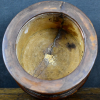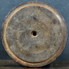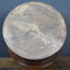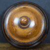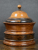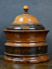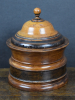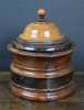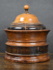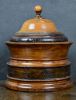 The circular turned wooden tobacco jar with loose high cover with a small ball shaped finial. The rim of the cover and center of the jar painted black.