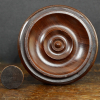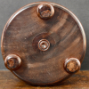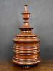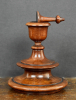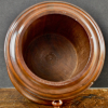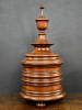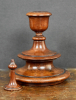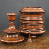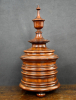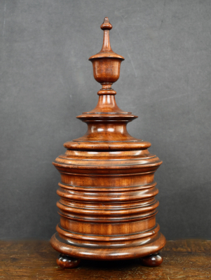 The round turned rosewood tobacco jar with loose cover. Standing on the three original wooden bun feet. The solid cover with a long baluster shaped container with cover with a long finial. The cover used to tamp down the tobacco in the pipe.