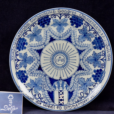 The small tin glazed earthenware plate commemorating the 27th International Eucharistic Congress in Amsterdam from 22nd – 27th July 1924, visited by thousands of pilgrims. The center decorated in shades of blue the host with HIS surrounded by a halo. Surrounded with vines, bunches of grapes and wheat leaves, symbols for bread and wine, the holy sacrament. Under the coat of arms of Amsterdam with the Emperor’s crown and on the rim the text: