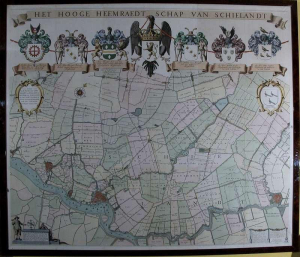 Decorated in shades of blue with two crowned wedding rings with WA & M, surrounded with branches and orange-coloured Apples of Orange and the text: