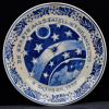 The tin glazed earthenware plate decorated in shades of blue with a satellite above the earth between the moon and stars and the text: