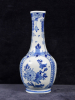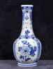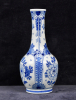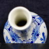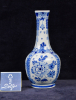 The small tin glazed earthenware vase / bottle with a long neck in the 17th century tradition decorated in shades of blue with rotating cartouches with flowering plants.