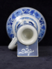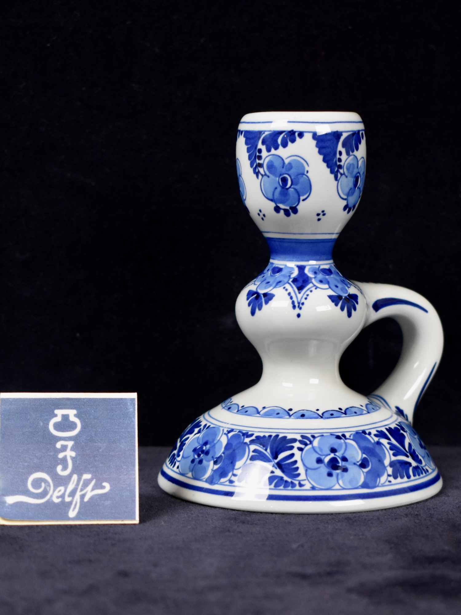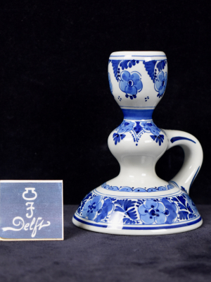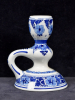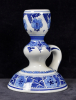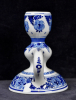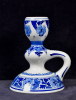 The round tin glazed earthenware chamberstick decorated in shades of blue with stylized flowers.