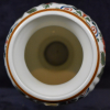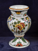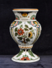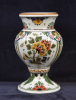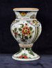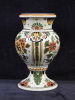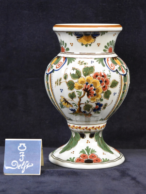 The small, corded tin glazed earthenware vase decorated in multi colours with flowering plants in three rotating panels. Further stylized leaves.