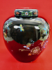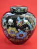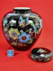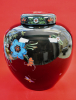 The tin glazed earthenware ginger jar decorated in colours on a black base with flowering plants with butterfly and a perched bird. The cover with stylized flowers.