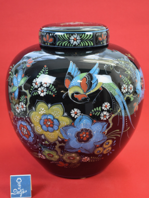For the 325th Jubilee of Royal Delft in 1978 The black Delft was new introduced. It was based on the “Famille Noire” that was already made in Delft in the late 17th century. A black base decorated with several colours. the so called: The wondrous Black of Delft.