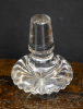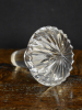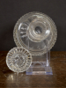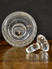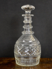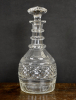 Antique 19th Century possible Waterford mallet shaped spirit cut glass decanter with a graduated facetted triple ring neck, a wide hobnail band below on a circular base,