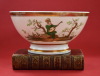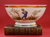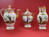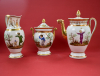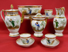 The hard paste porcelain tea set in Empire style containing a teapot, sugerpot with lid, milk jug wash out bowl, 12 saucers and twelve cups with ears. All hand painted scenes on the body decorated in colours depicting children’s games in different outfits in a parklandscape and decorated with gold.