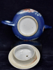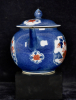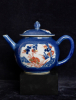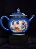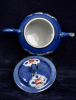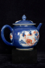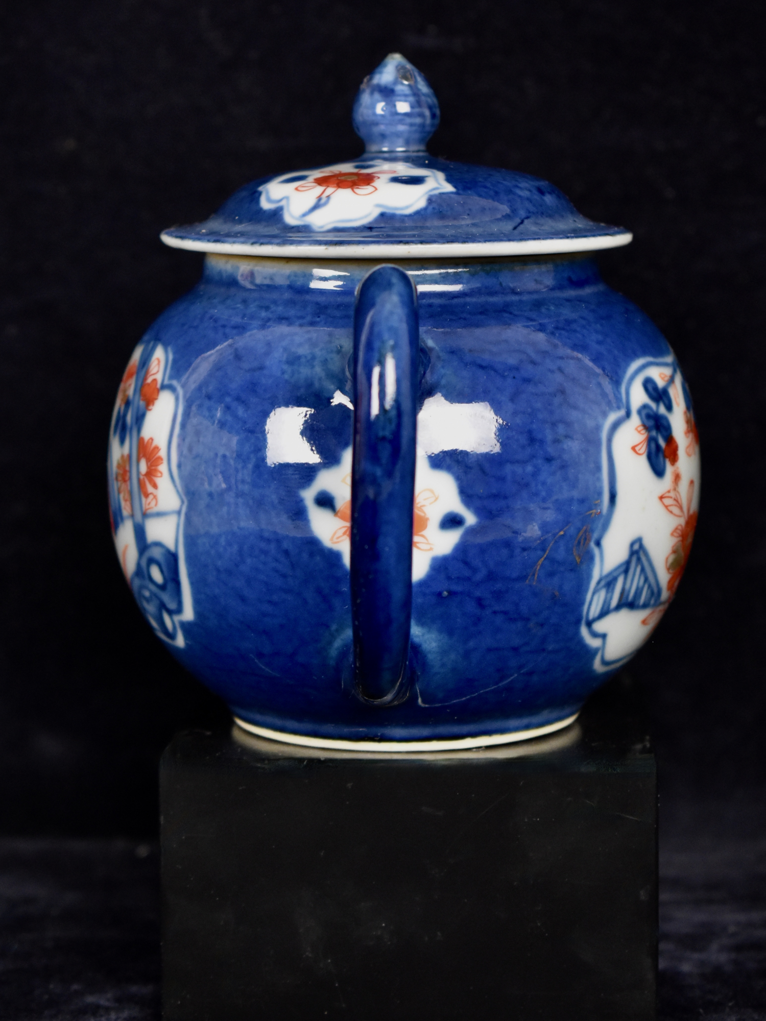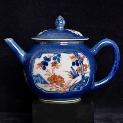 De theepot gedecoreerd in het blauw met twee witte cartouches met bloemmotieven in een tuinlandschap.