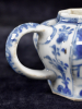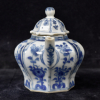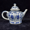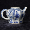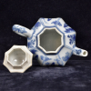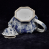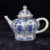 Het achthoekige theepotje gedecoreerd in het blauwwit met bloemmotieven en Lange Lijzen in een tuinlandschap.