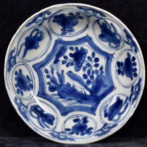 De twee bordjes gedecoreerd in de Famille Rose palette met bloeiende planten in een vergulde gedecoreerde cirkel met roterende bloeiende takken op de rand.