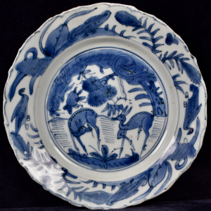 Antieke Vroeg 17e Eeuwse Chinees Blauwwit Porceleinen Ming Wanli Bord met Hertjes