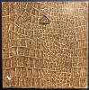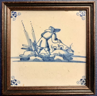 The square majolica tile decorated in shades of blue with a standing shepherd and three sheep in a landscape.