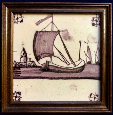 The square majolica tile decorated in purple with a Dutch Brown Sailing Vessel . Spider heads as corner motif. Nederland Circa 1800. In wooden frame 15 x 15 cm. Weight: 282 grams