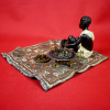 This Austrian cold painted bronze image displays an authentic Franz Xaver Bergmann cold-painted bronze figurine, specifically depicting a young boy or "lad" preparing coffee while seated on a Persian carpet. This piece is known for its intricate detail and vibrant colours, characteristic of Bergmann's work.
