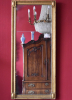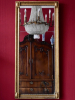 De twee latere rechthoekige spiegelplaten omgeven door een met o.a. parelwerk versierde rand van gestoken en verguld lindenhout. De achterzijde met panelen van eikenhout.