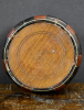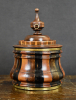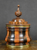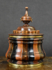 De uit losse delen opgebouwde ronde tabakspot bestaande uit drie verschillende houtsoorten, palissander, kastanje en satijnhout, bijeengehouden door twee geelkoperen banden. De losse deksel met opstaande rand van twee houtsoorten en gedraaide hardhouten balustervormige knop