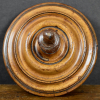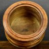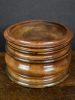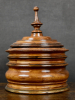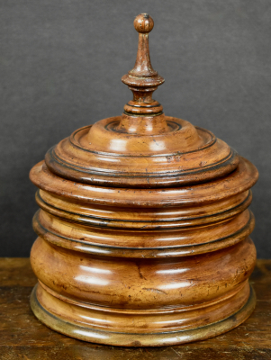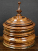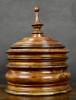 De ronde gedraaide houten tabakspot met losse deksel met houten lange baluster knop.