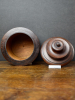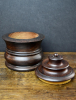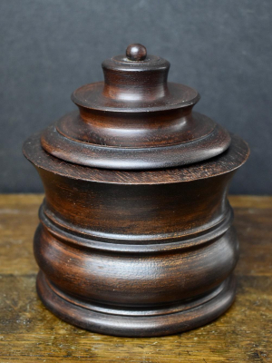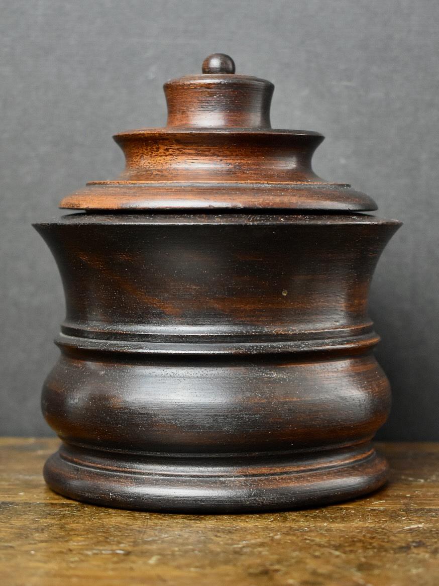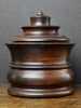 De uitgedraaide houten tabakspot met losse deksel met klein houten rondknopje. Onderzijde deksel voorzien van schuimrubber. Nederland, Circa 1950 Hoogte: 16 cm. Diam.: 14,3 cm. Gewicht: 567 gram.