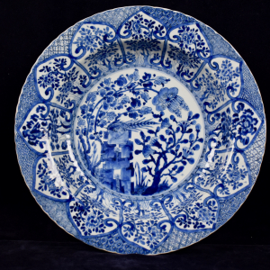 The tin glazed earthenware plate decorated in shades of blue with a Paltrok windmill (Wipmill) on a waterfront in a Dutch landscape. The rim decorated with stylized floral motifs.