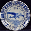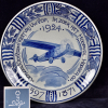 The tin glazed earthenware plate commemorating Van der Hoop’s flight from Holland to the Dutch Indies. Decorated in shades of blue with in the centre the airplane Fokker F7 H - NACC flying over clouds and the text: