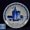 The tin glazed earthenware plate decorated in shades of blue with the gateway of Enkhuizen, De Dromedaris, with the red-white-blue coloured Dutch flag on the top and: