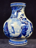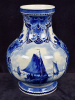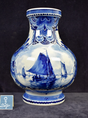 The rare tin glazed earthenware baluster vase decorated in shades of blue with a Dutch landscape with a Dutch brown sailing vessel in a in a cartouche surrounded with flowering plants and floral motifs.
