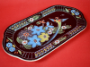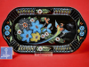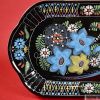 The tin glazed rectangular earthenware dish with flattened corners is a dish shape that has been part of dinner services from the 18th century, made in both Chinese porcelain and Delft earthenware. Decorated in several colours on a black base with flowering plants and a bird.