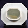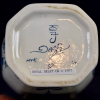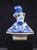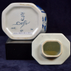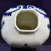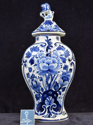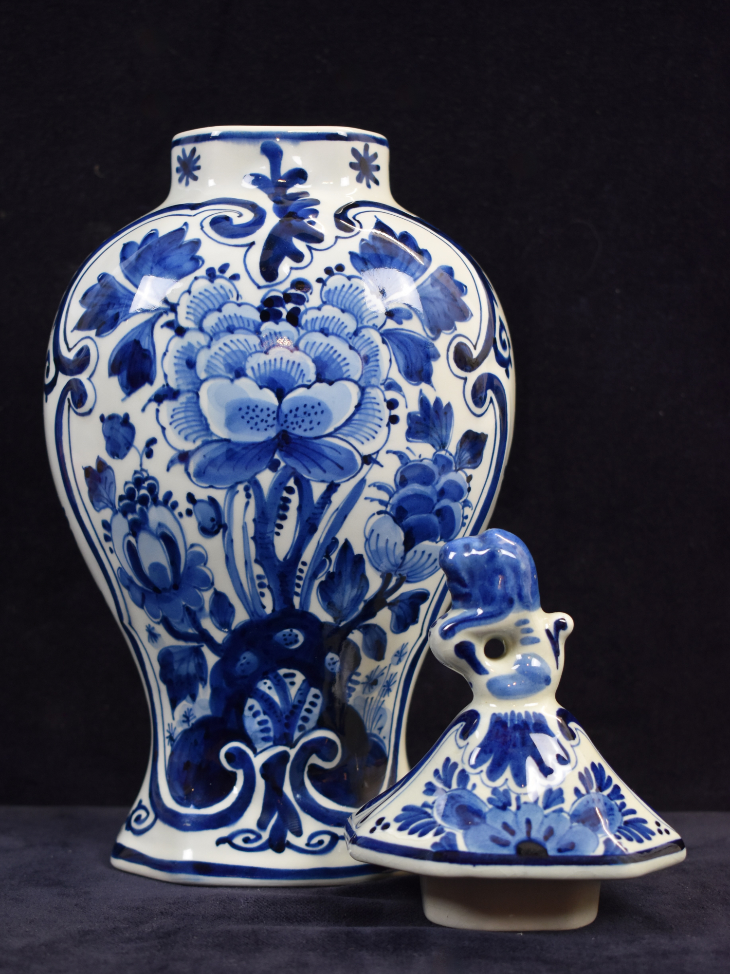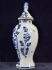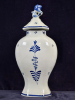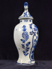 The tin glazed earthenware baluster vase with cover decorated in shades of blue with flowering plants on rockwork. The domed cover surmounted with a sitting lion. Signed on the bottom in underglaze blue for: