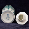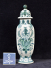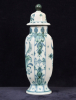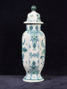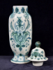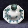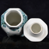 The rare small octagonal shaped tin glazed earthenware jar decorated in shades of soft green with stylized floral and geometric motifs. The domed cover with green finial decorated en suite. Finished with a matt milky glaze.