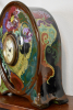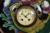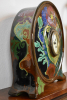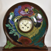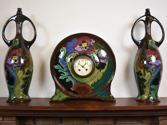 The monumental tin glazed pottery (plateel) mantel clock with porcelain dial. The round body painted in multi colours in lush Art Nouveau manner, supported by four feet. Based marked Zuid-Holland, artist initials TV (likely from an original design by Johannes Hendricus Hartgring), incised 74 P (for 1894) and two vases decorated with flowering branches.