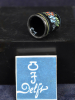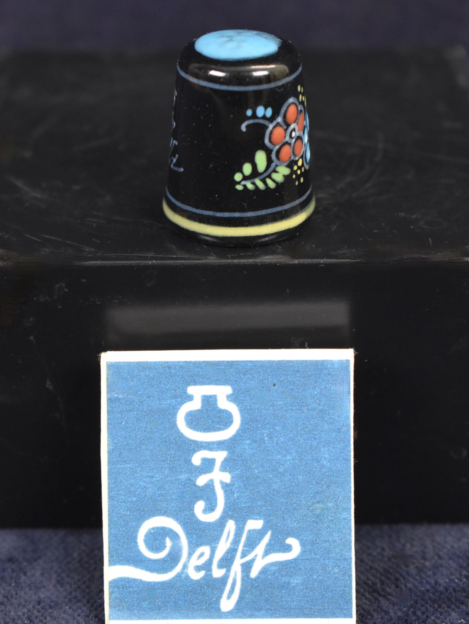 The tin glazed earthenware thimble / vingerhoed decorated in colours on a black base with a flowering plant and the Royal Delft Signature with JT & Delft